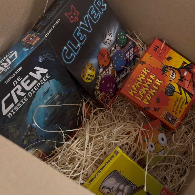 - Inhoud met gezelschapsspellen, kaartspellen, puzzels of kleine fun-items